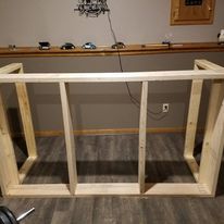 The next step is to build your bar top, this is where it gets a little more complicated. To give your bar that professional bar look I would go with a Chicago Bar Rail to rest your elbows on when at the bar. Trust me it is worth it. If you decide to build your bar top using a Chicago bar rail this requires two pieces of 3/4” plywood one on top of each other. Your bottom sheet has to be 1” 9/16” wider then your top sheet where you are going to have your Chicago bar rail. I made sure I cut the bottom sheet so I would have 10 inches of overhang on the bar where people will sit and your bar stools will be. This gives you enough room so your knees don’t hit the front of the bar when you sit on the stool and straddle up to the bar. If you use a foot rail you might go with more of an overhang. You screw the bottom sheet from the top on to the frame. Then you rip your top sheet remembering where the bar rail will have to be 1” 9/16” less then what you cut your bottom sheet. You then screw the top sheet onto the bottom sheet by screwing under the bottom sheet. Use 1 1/4 wood screws so your screws don’t come through the top of the bar. Mitering the bar rail is easy, just use a 2×4 and set your bar rail onto the 2×4 where the bar rail sits on the bottom sheet of your bar top. Make sure your screws are long enough to go into the bar rail and short enough so they don’t come through the top of your bar rail.