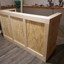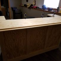 Next step is to finish off the inside walls of your bar. You can do this with drywall or if you have enough left over pieces of veneer plywood you can do what I did. I also trimmed out the edge of the bar top using pine molding.